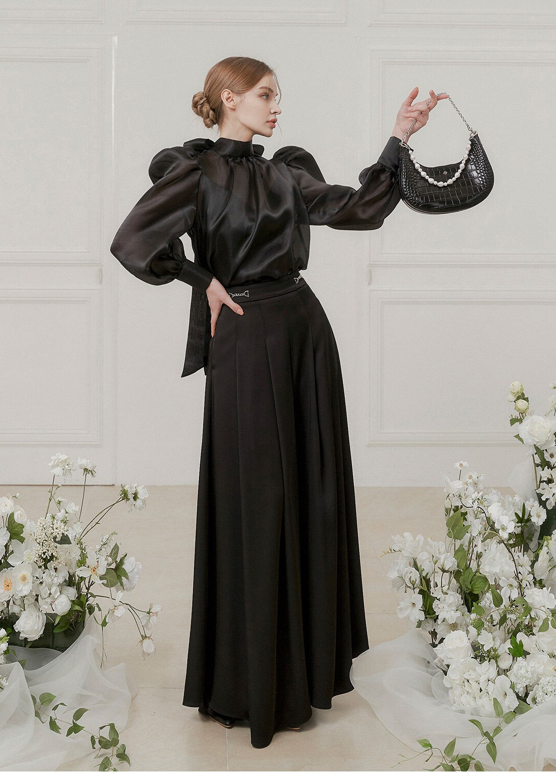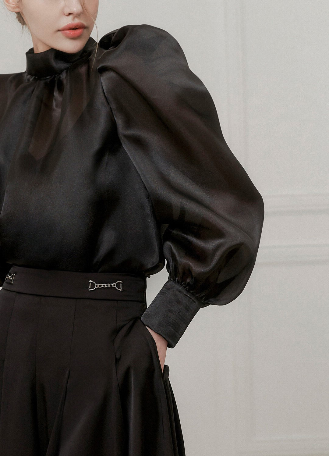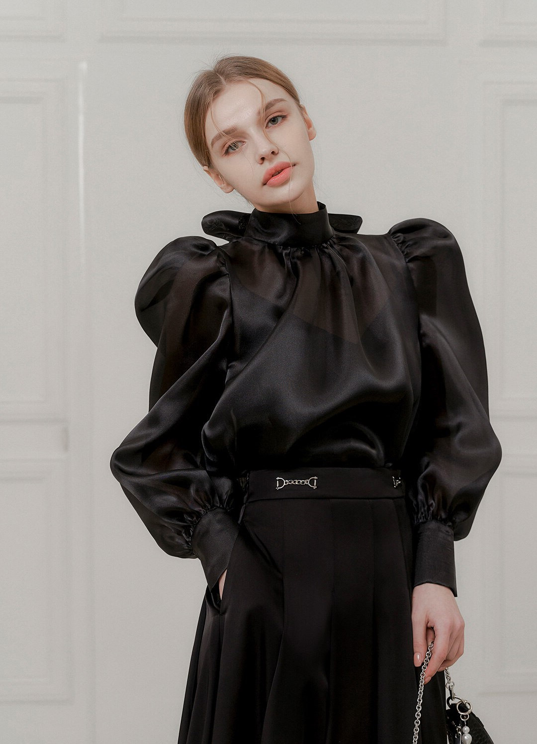 This black satin shirt is both dramatic and sophisticatedly elegant, adding a haute couture-like volume to your wardrobe. The high neck and structured puff sleeves flatter a polished silhouette, while the smooth, lightweight satin fabric drapes like silk against the skin. The long, fitted cuffs complement the crisp sleeves, exuding refined style—making it the ideal choice for evening events, formal occasions, or any occasion where you want to project a fashionable and edgy look.