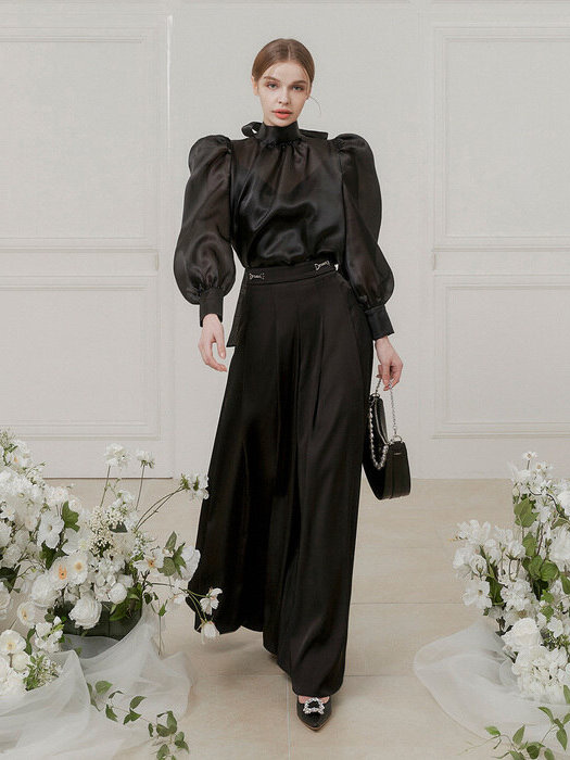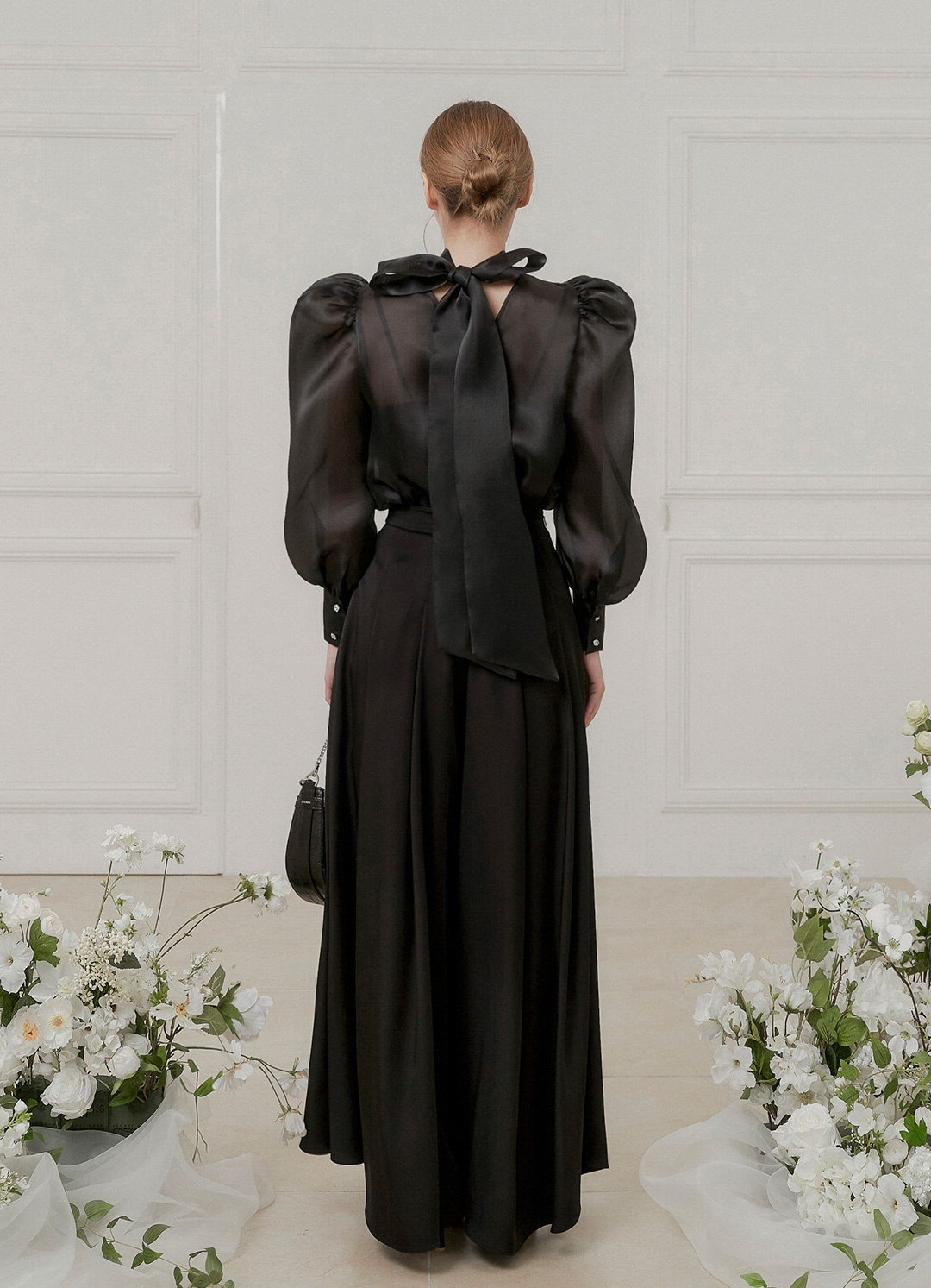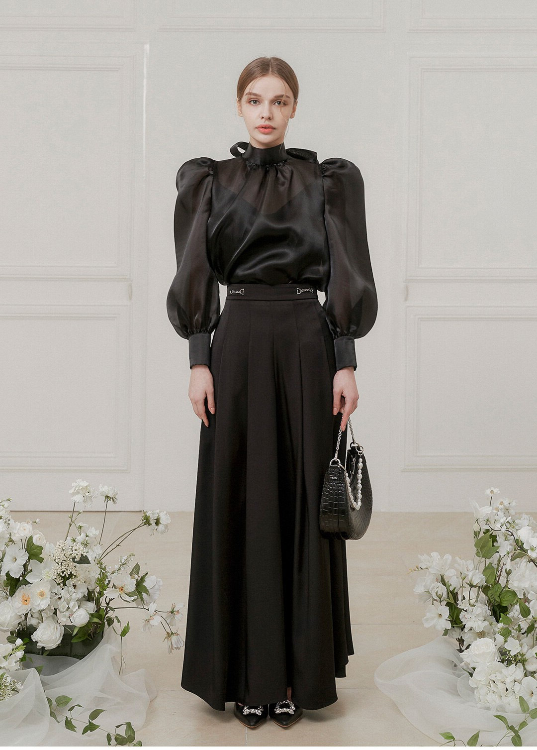 This black satin shirt is both dramatic and sophisticatedly elegant, adding a haute couture-like volume to your wardrobe. The high neck and structured puff sleeves flatter a polished silhouette, while the smooth, lightweight satin fabric drapes like silk against the skin. The long, fitted cuffs complement the crisp sleeves, exuding refined style—making it the ideal choice for evening events, formal occasions, or any occasion where you want to project a fashionable and edgy look.