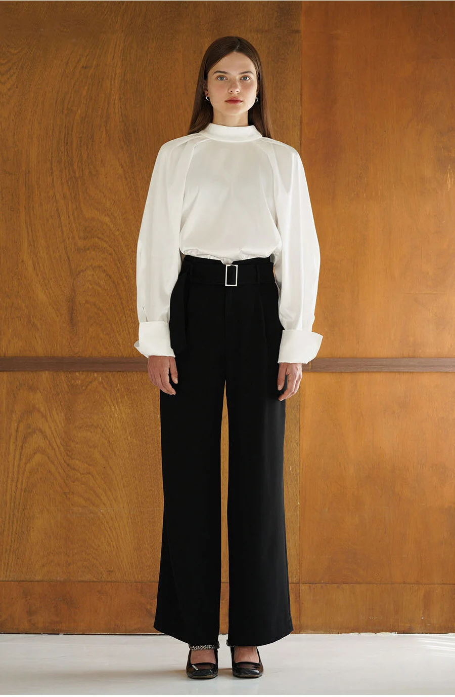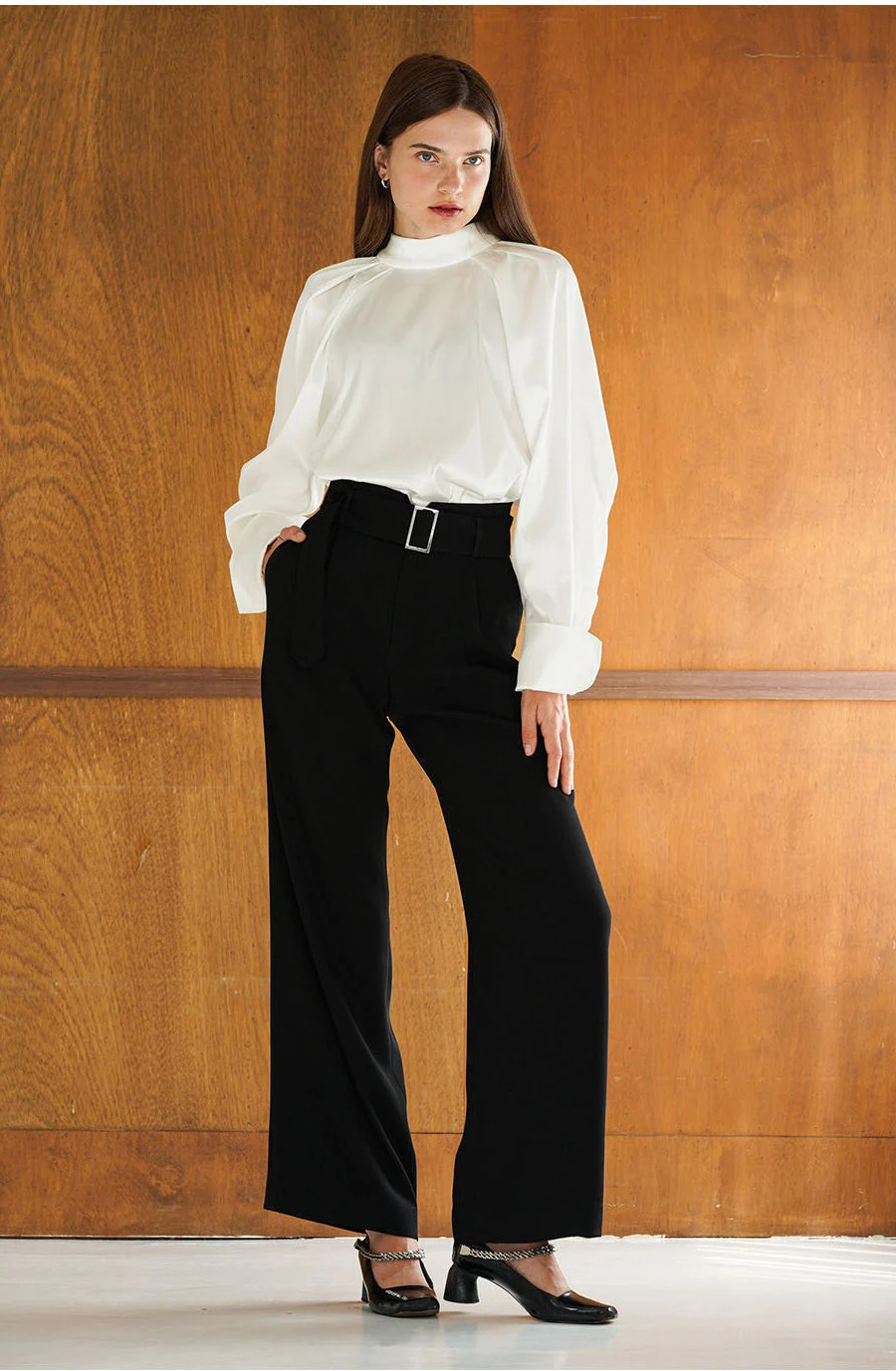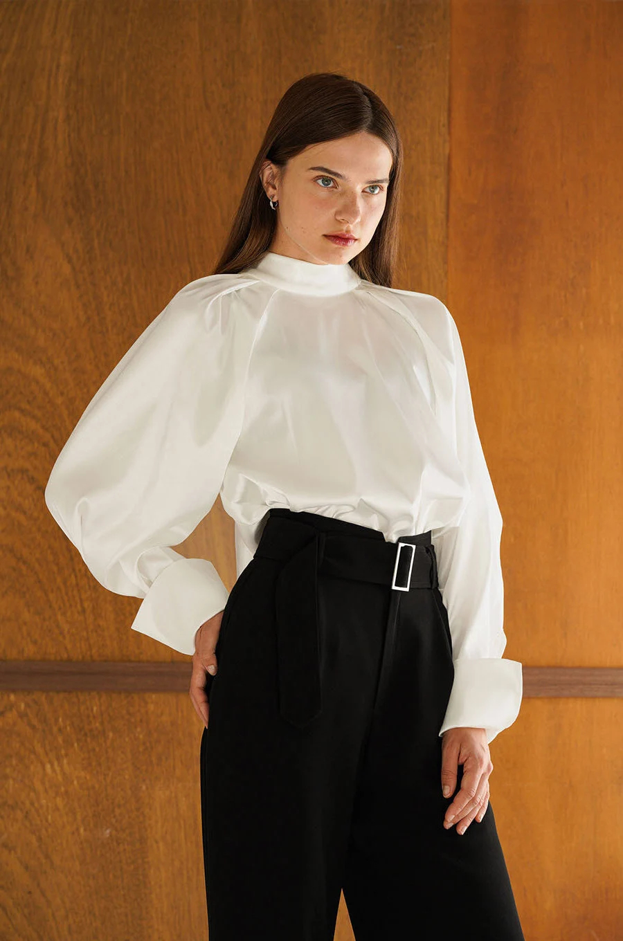 This ivory shirt is modern and sophisticated, with clean, flowing lines and a soft, comfortable texture. The silky satin fabric drapes beautifully, flattering the figure; the high collar and sculpted shoulder pleats create refined lines and a subtly architectural silhouette. The puffed sleeves gather into wide cuffs, adding a touch of understated drama without sacrificing elegance and practicality—making it ideal for the office, a dinner date, or any occasion where you want to project understated luxury.