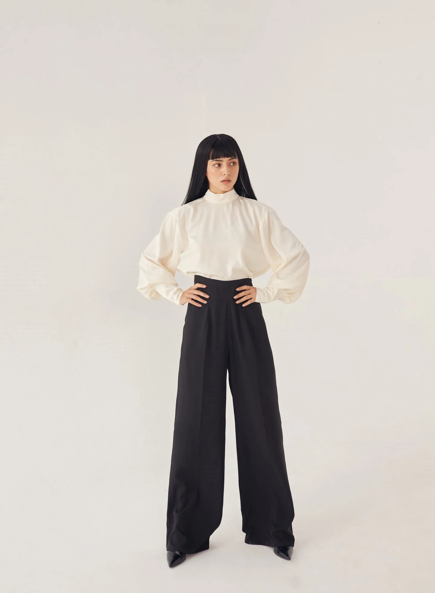 This ivory turtleneck shirt exudes understated elegance, adding a touch of serene sophistication to any look. The smooth, flowing fabric drapes naturally from the neckline, while the slightly puffed sleeves gather into refined cuffs, showcasing an air of elegance. Its clean lines and timeless silhouette make it the perfect choice for a polished professional look, an evening event, or any occasion where effortless sophistication is desired.