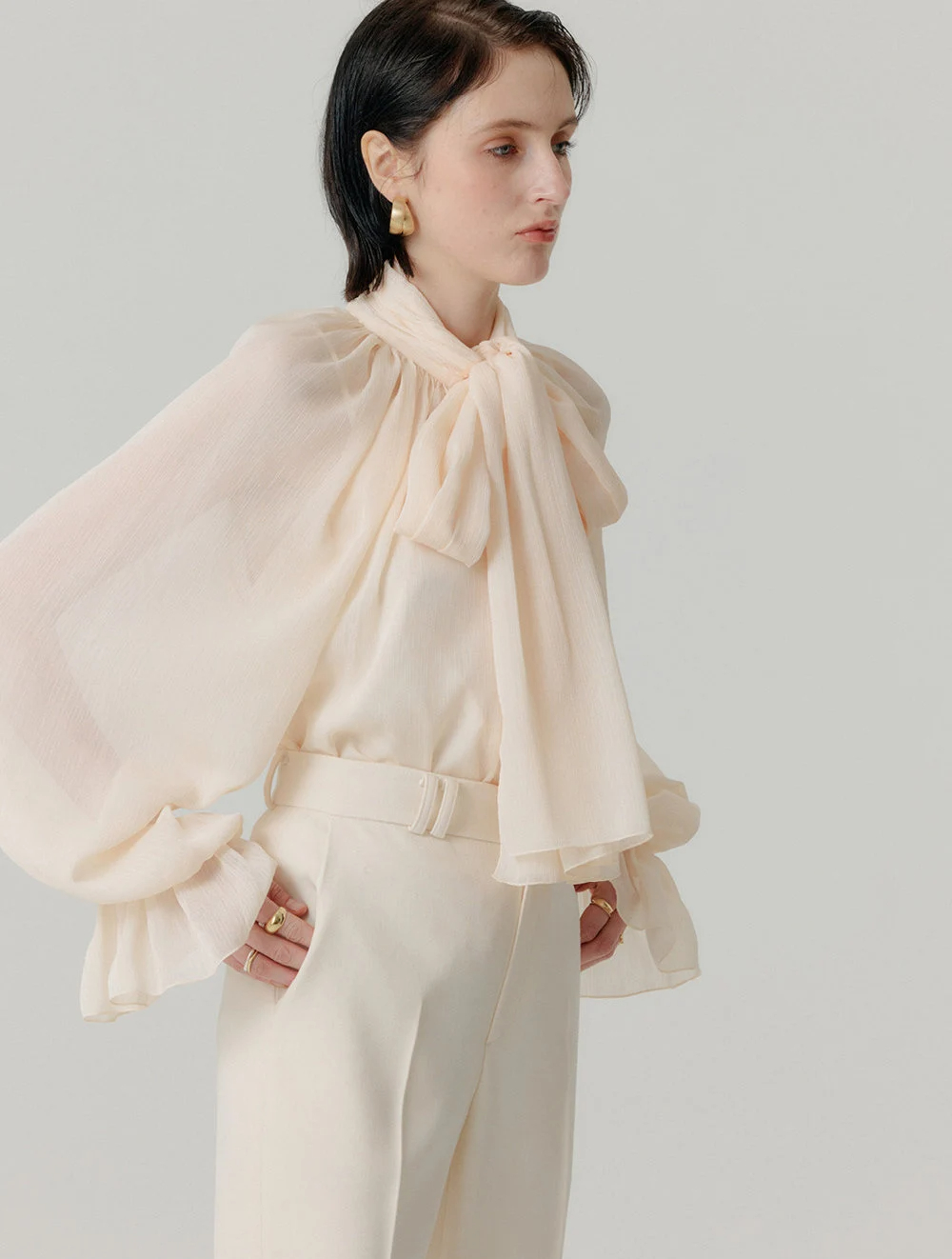 This soft pink chiffon blouse is romantic and light, making you elegant with every step. The oversized bow neckline exudes sophistication, while the flowing silhouette gently hugs the body, creating a cloud-like lightness. Long, puffy sleeves with slightly flared cuffs add a touch of drama and femininity, making it the ideal choice for elegant everyday wear, special evening events, or any occasion where you want to showcase understated luxury.